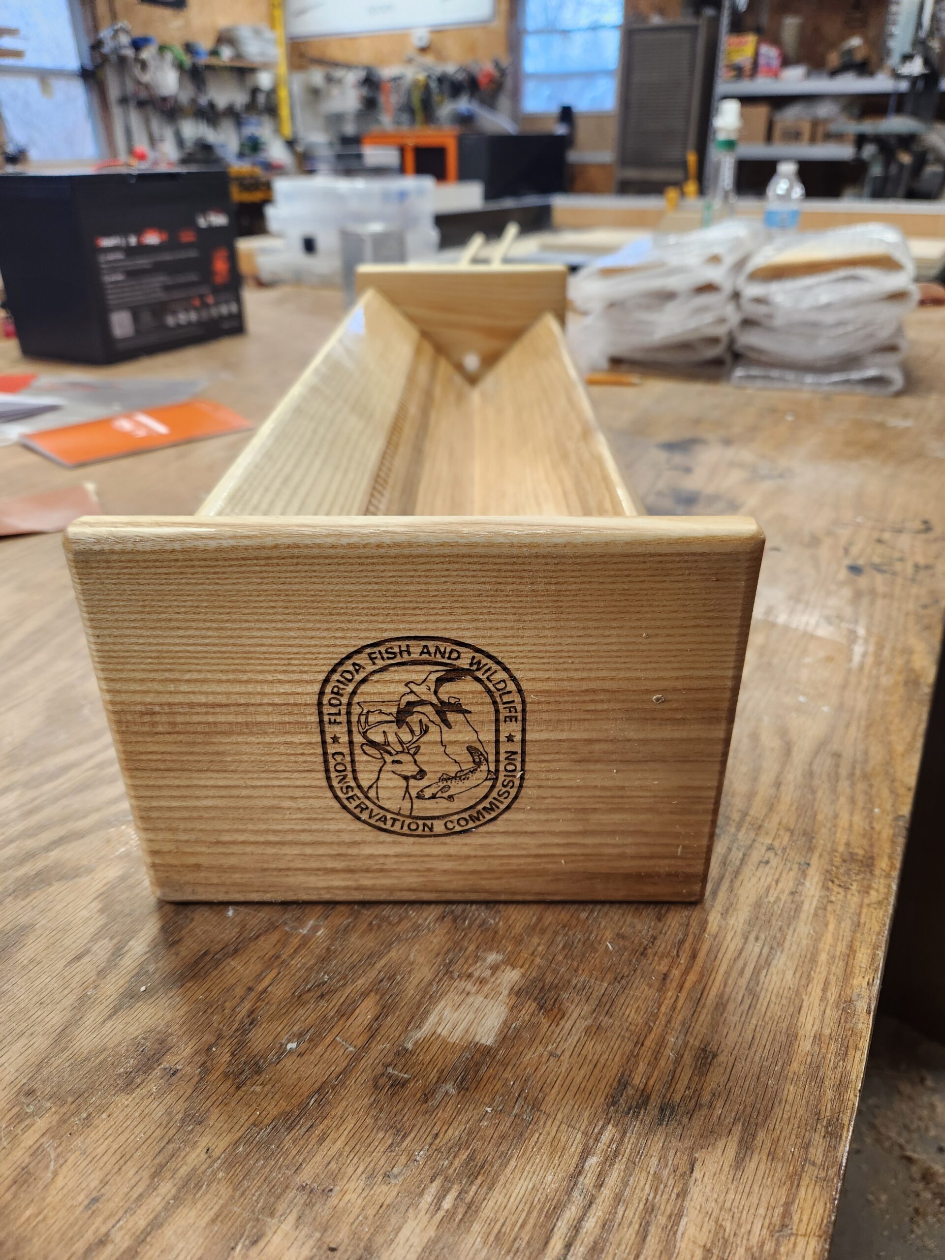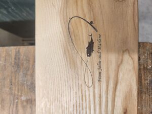 We’ve added a couple laser engravers to the workshop recently and switched to laser engraved rulers on the fish measurement boards. The aluminum rulers were hard to get in 48 inches and became very pricey when we could find them. Not to mention they would peel from time to time. We had good luck with vinyl rulers, but still they could peel up at the ends. A laser engraved ruler will last forever. The are dead-on accurate. We still coat the surface with epoxy for a smooth, safe surface for the protection of the fish. We can also personalize your boards with the laser engraver. We can create any kind of ruler but the standard ruler has both English/Metric measurements. The sides and back are fastened with stainless steel wood screws. The boards are coated with spar urethane for a long-lasting finish.